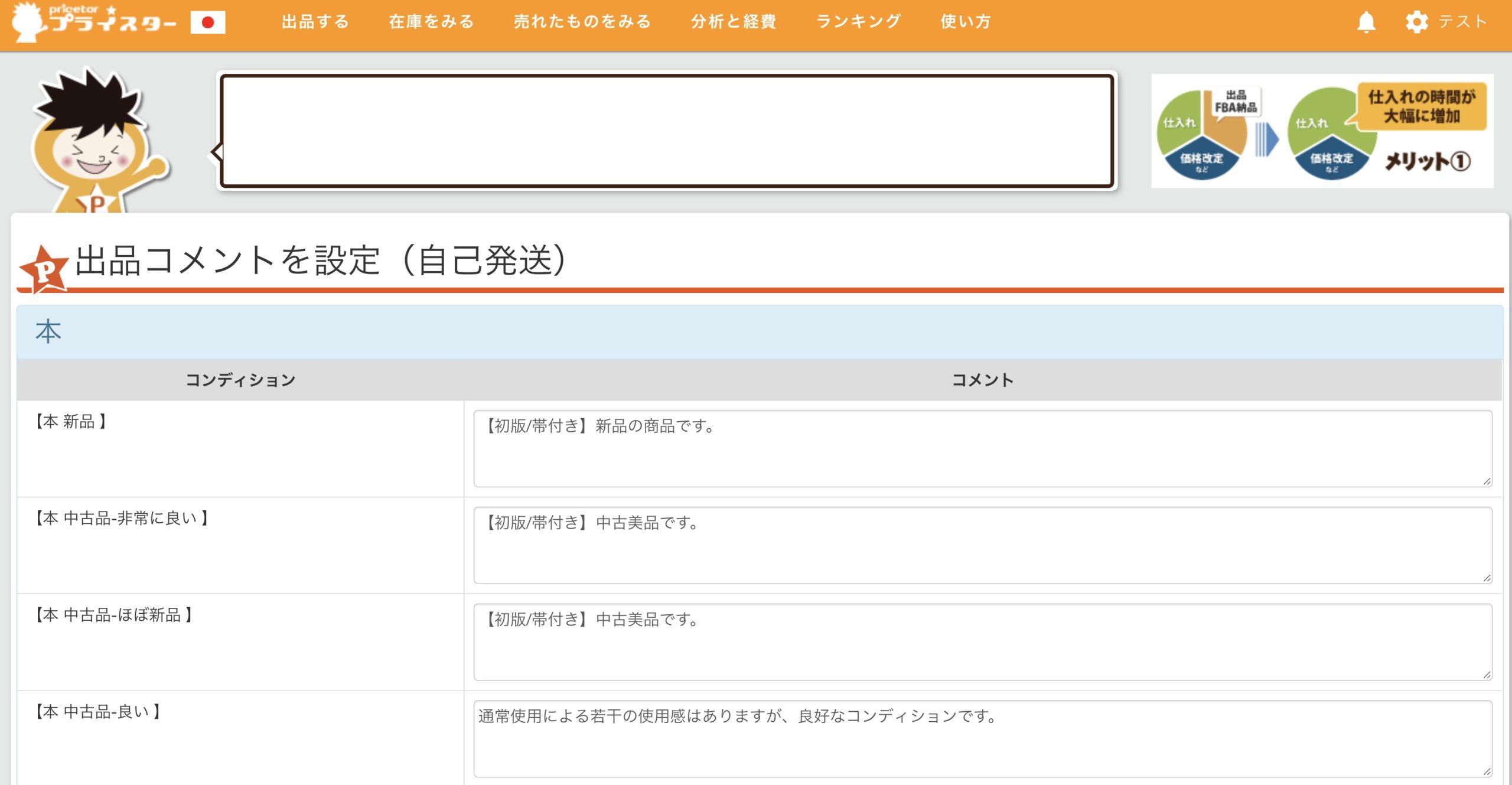 こちらは初期設定の状態ですが、プライスターではカテゴリー・コンディションごとに商品説明を変更できます。