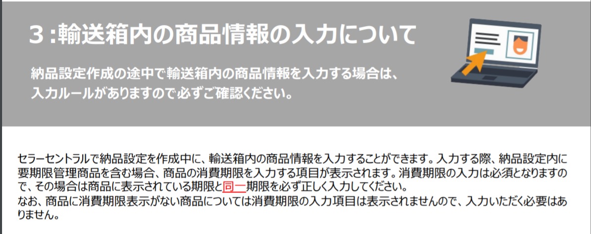 しかしながら、期限が異なる場合は、同じ箱に入れて納品はできかねてしまいます。 下記に「要期限管理商品FBA実践マニュアル」