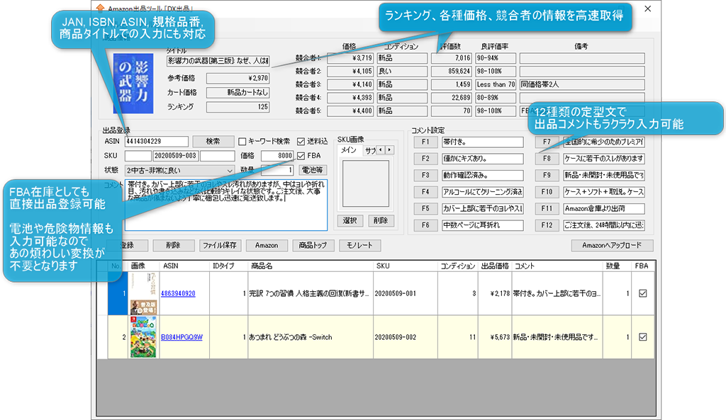 SKU商品画像アップやFBA直接出品も可能な高速出品ツール『DX出品』と、細かな設定で思い通りの価格に改定できる価格改定ツール『自価調』をセットにして脅威の980円(税別)/月という価格で再リリースいたします。