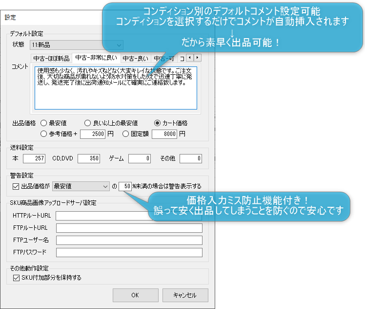 こちらは初期設定の状態ですが、プライスターではカテゴリー・コンディションごとに商品説明を変更できます。