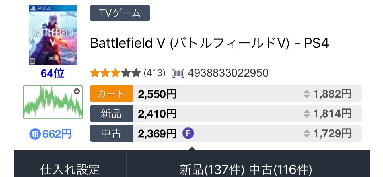無料アプリだと「可」込みの最安値なので、状態の悪い商品の最安値で仕入れ判定します。