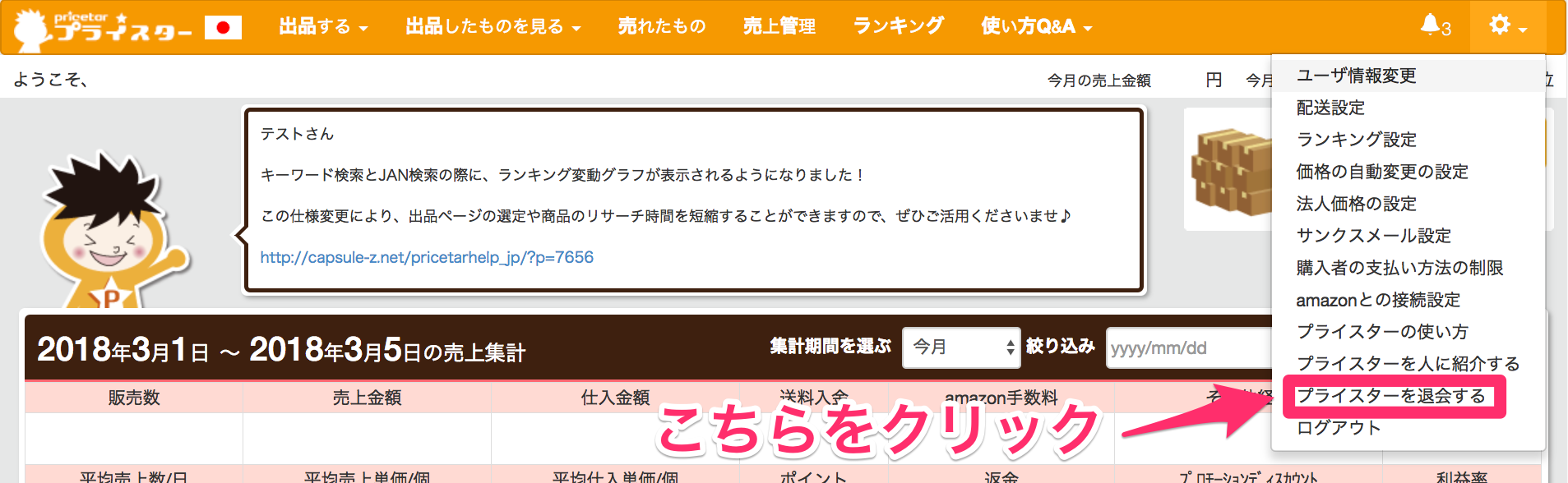 プライスターにログインして右上から「プライスターを退会する」をクリックします。