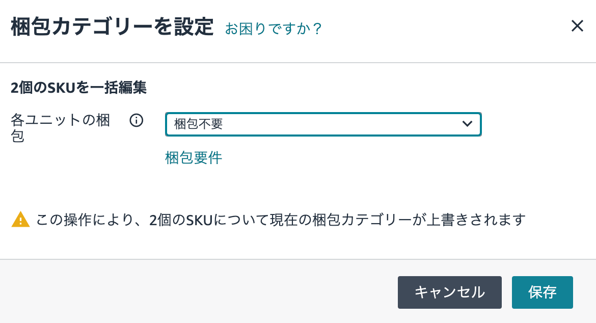 基本は「梱包不要」を選んで「保存」をクリックするのですが、本せどりのように毎回大量の新しいSKUを作成して出品する方は逆に手間になります。