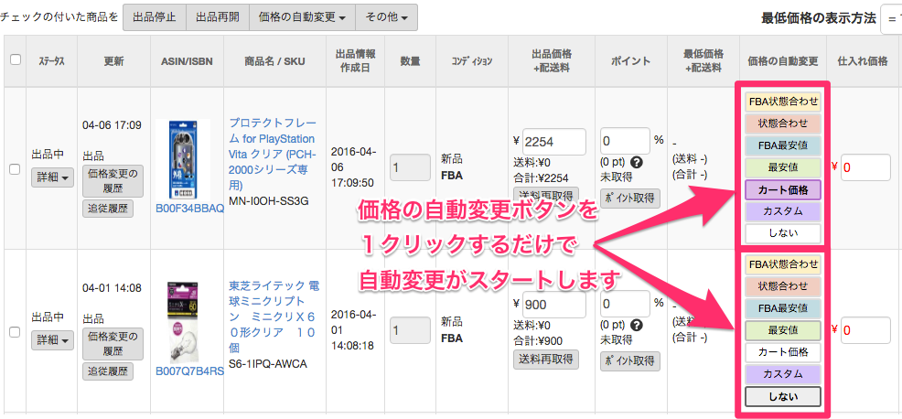 他社のツールだといちいちASINやJANコードから、出品するSKUを選択しなければならないし、間違えて違うSKUを選択することがあります。
