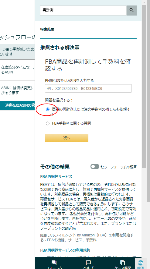 そしたら右からなんかにょろと出てくるので、ASIN入力して、「 商品の再計測または注文手数料の補てんを依頼する」をチェックして、「次へ」を押します。