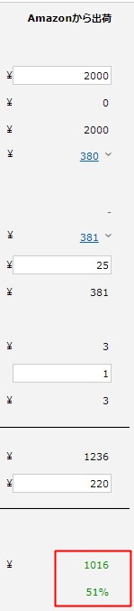 | AmazonFBA | 380円 | FBA手数料381円+FBAへの送料25円 | 1211円 |