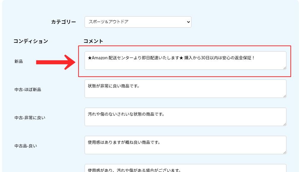 こちらは初期設定の状態ですが、プライスターではカテゴリー・コンディションごとに商品説明を変更できます。