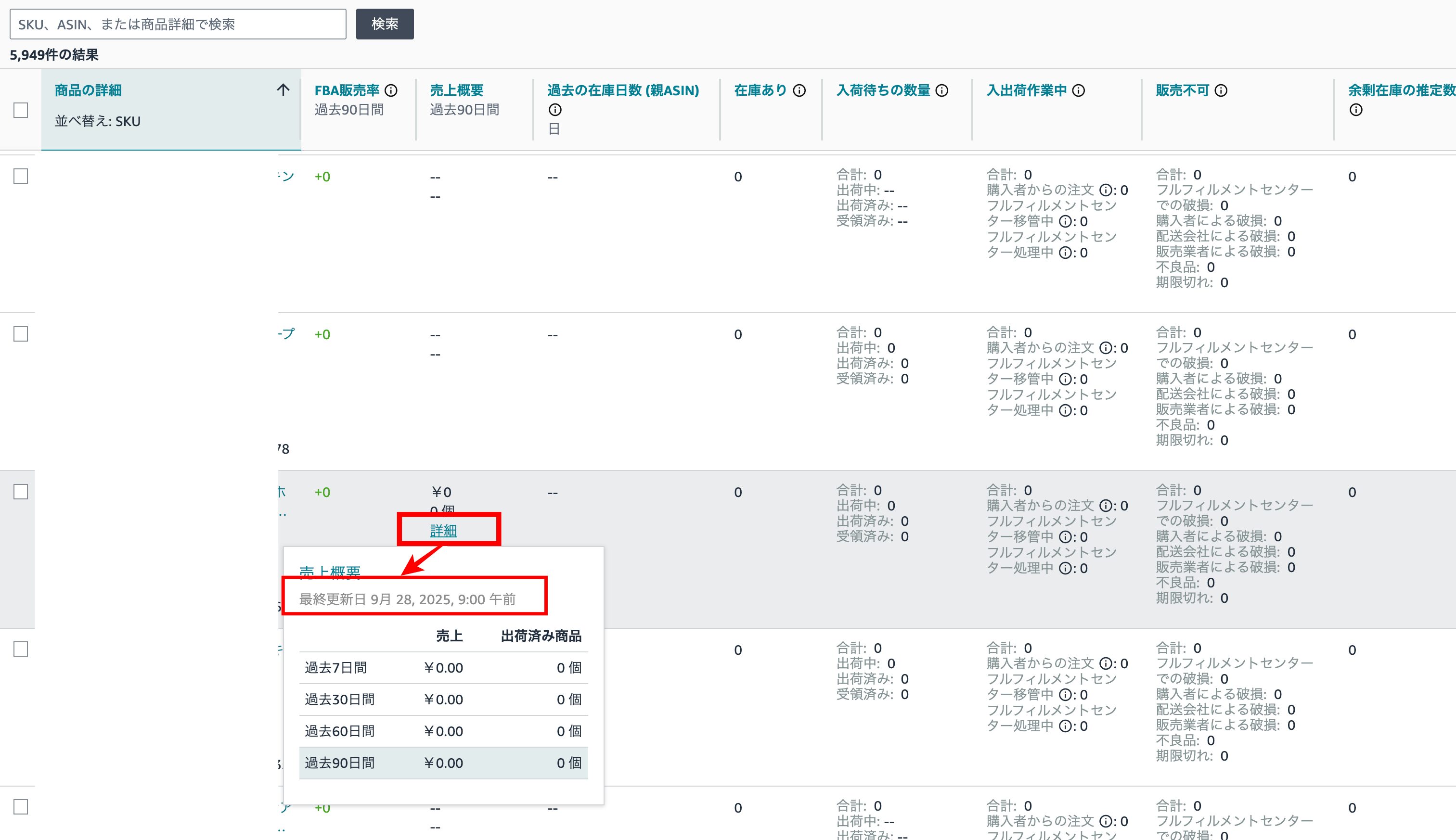 対象の商品の「詳細」をかざしたらにょろって出るのですが、最終更新日が出ます。