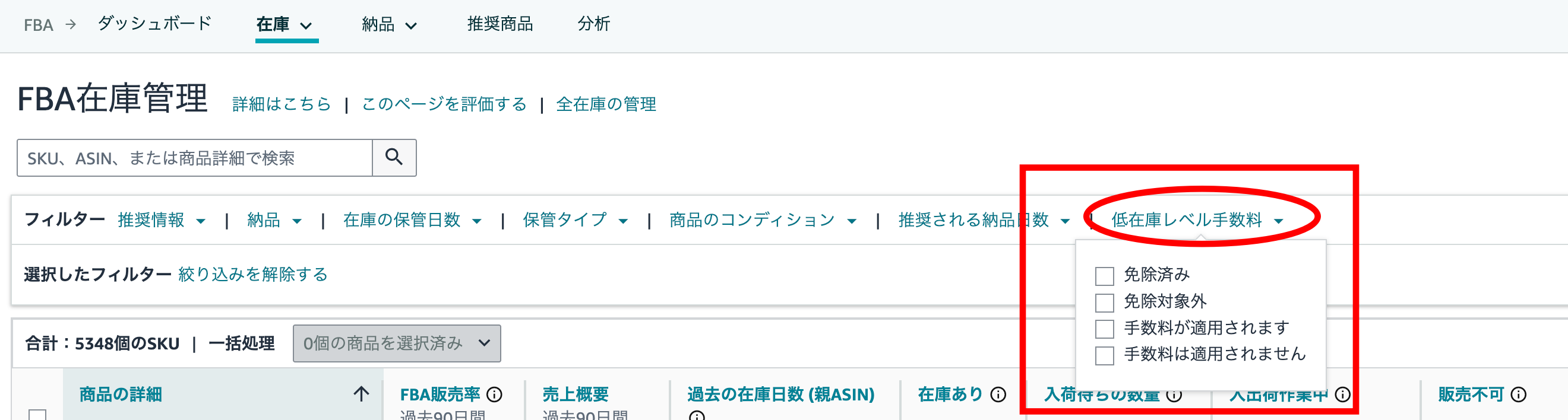 「手数料が適用されません」は現在低レベル在庫手数料が課されないものが表示されます。